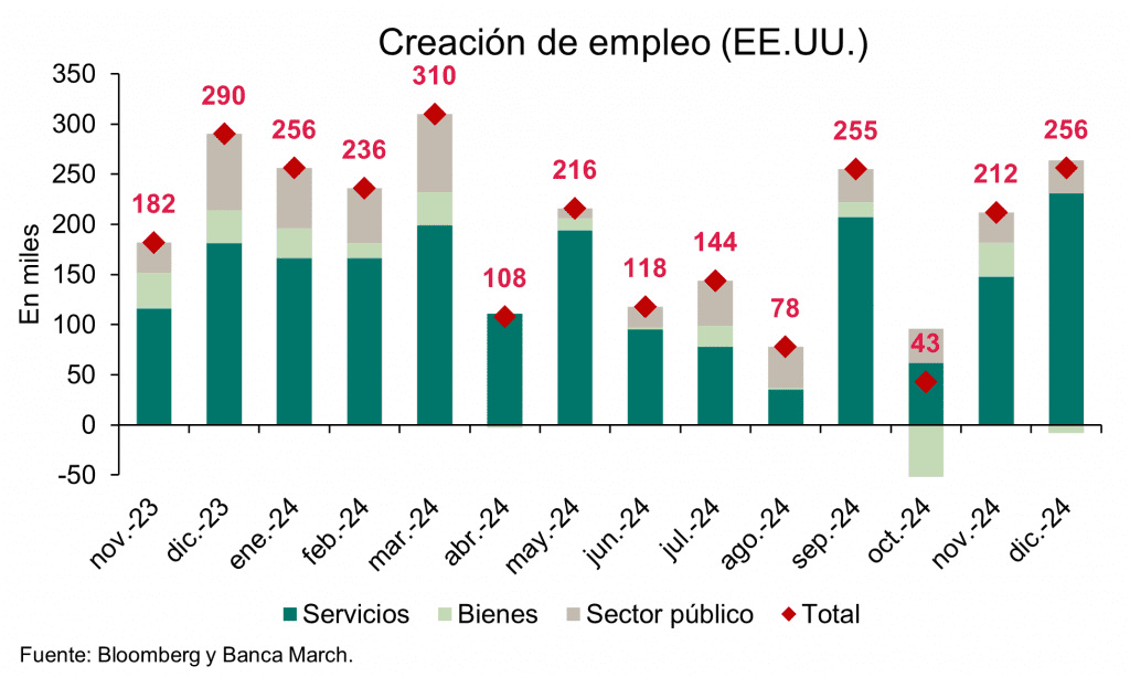 Banca March | El crecimiento del empleo en diciembre repunta hasta los 256.000 nuevos empleos, por encima de los 165.000 previstos por el mercado y también de los 212.000 del mes de noviembre (revisados a la baja desde 227.000). La tasa de empleo se reduce una décima hasta el 4,1% y la tasa de participación total se mantiene estable en el 62,5%. Además, los salarios escalaron a ritmos del +3,9% interanual (+0,3% mensual) manteniendo un ritmo razonable de crecimiento, una décima por debajo del mes pasado. Sectorialmente, el lado de los servicios sigue dominando la creación de empleo (especialmente salud y educación) mientras que los segmentos más industriales siguen débiles, destruyendo empleo en la mayoría de los casos. Por otro lado, el empleo público continúa apoyando la creación de puestos de trabajo (33.000 nuevos puestos) en el último mes completo de la administración Biden.