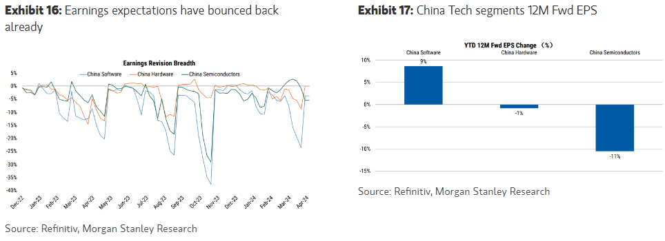 Morgan Stanley | De acuerdo con la última encuesta AlphaWise de CIOs en China, las expectativas de crecimiento para 2024 han caído hasta un 10% (-3% vs la segunda mitad de 2023). El ratio de revisión de presupuestos (con previsión de un año) se ha reducido a 2.3x vs 3x en el 2S23, lo que indica una menor confianza entre las empresas del país. Dicho esto, el equipo tecnología de China cree que el mercado ya ha descontado el débil Outlook teniendo en cuenta que: