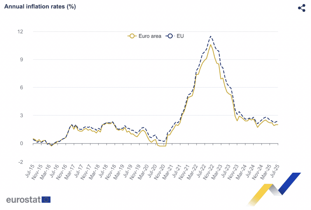 CdM | La tasa de inflación anual de la zona del euro fue del 2% en julio de 2025, estable en comparación con junio. Un año antes, la tasa era del 2,6%. La inflación anual de la Unión Europea fue del 2,4% en julio de 2025, frente al 2,3 % de junio. Un año antes, la tasa era del 2,8%. Estas cifras han sido publicadas por Eurostat, la oficina estadística de la Unión Europea.