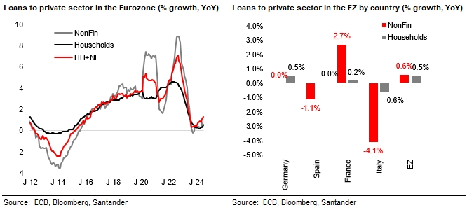 Santander Research | El BCE publicó ayer los datos de préstamo al sector privado en la Eurozona, con un aumento de 29.000 millones de euros en julio, su sexto mes consecutivo en positivo, de modo que su crecimiento interanual ha aumentado hasta el +1,3% vs +1,1% en junio, aunque todavía se encuentra muy lejos de los niveles pre-pandemia en torno al +3,5%. El préstamo corporativo se sitúa en el +0,6% a/a vs +0,7% en junio y el préstamo a hogares en el +0,5% vs +0,3% en junio. Entre las grandes economías europeas, solo los préstamos corporativos franceses mantienen un crecimiento interanual (+2,7% a/a vs. 0% de los alemanes, -1,1% de los españoles y -4,1% de los italianos), si bien destaca la progresiva recuperación del préstamo corporativo español desde un mínimo del -4,3% a finales de noviembre de 2023 hasta el -1,1% de julio. El préstamo a los hogares es positivo tanto en Alemania (+0,5% a/a) como en Francia (+0,2%) y ya está plano en España, si bien todavía es negativo en Italia (-0,6%). De cara a los próximos meses, podríamos seguir asistiendo a un progresivo aumento del crédito al sector privado respaldado por una gradual, aunque aún ligera, caída de los costes de financiación (hasta el 5% en junio en los nuevos préstamos corporativos vs. 5,23% en octubre de 2023 y hasta el 3,7% en los préstamos a hogares vs 4,1% en noviembre de 2023) y en línea con la última encuesta de condiciones de financiación bancaria del BCE, donde los bancos esperan un aumento de la demanda en el 3T24 tanto del préstamo corporativo como sobre todo de las hipotecas.