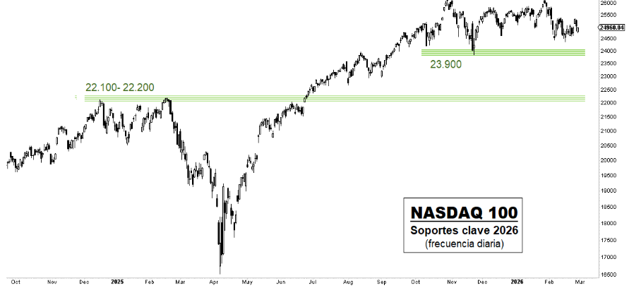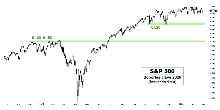 Renta 4 | Los principales índices americanos comienzan la semana en una tónica muy similar a la de los últimos tres meses, sumidos, especialmente el S&P500, en un tedioso rango lateral, con soporte en niveles de 6.780 puntos y resistencia en 7.000 puntos. Los dos grandes soportes de cara a este año para el S&P500 y NASDAQ100 se aprecian perfectamente en el gráfico inferior, con los mínimos de noviembre en 6.520 puntos como nivel clave de corto plazo en el S&P500 y la franja de 6.100-6.150 puntos como su punto clave de cara al medio plazo. Niveles equivalentes en el índice tecnológico serían los 23.900 puntos y la franja de 22.100-22.200 puntos.