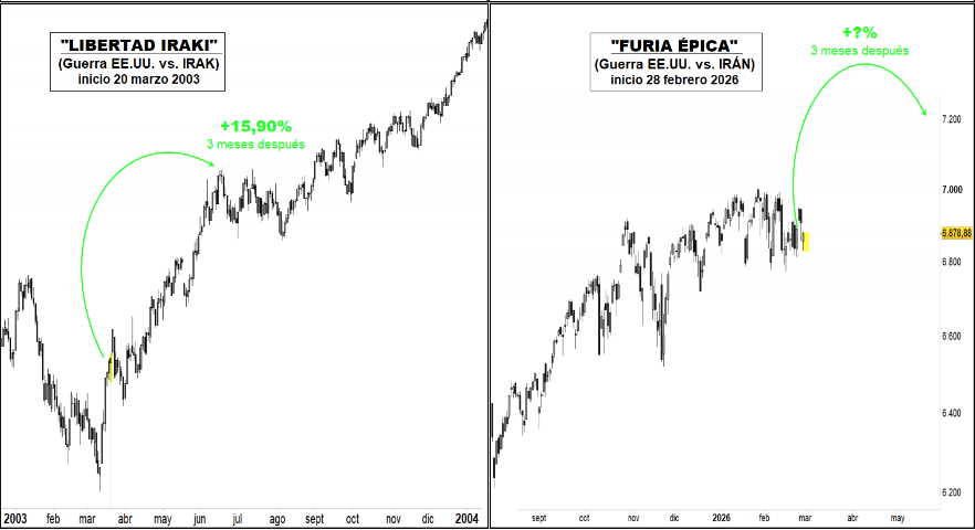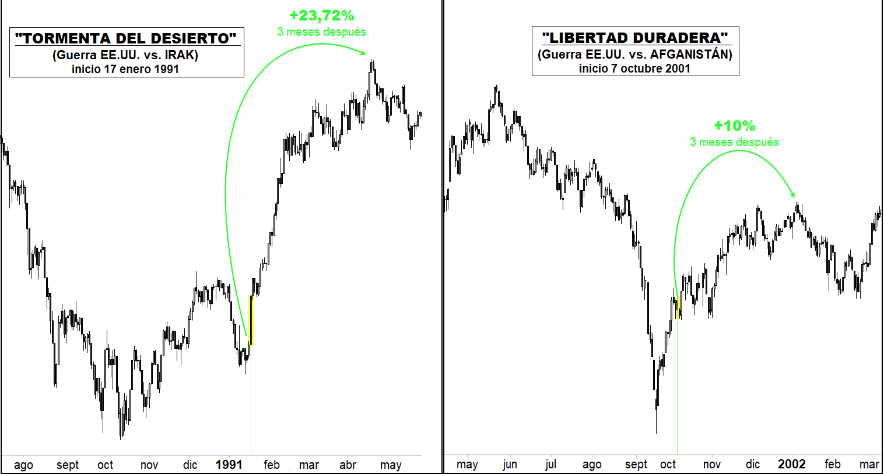 Desde 1991, los tres conflictos de EEUU con países de Oriente medio han sido alcistas a tres meses (y más allá) para el S&P500. Rompiendo la lógica de estos aciagos eventos, como podemos apreciar en el gráfico inferior, históricamente el comportamiento del principal índice americano ha venido siendo positivo tres meses después del inicio de las tres principales contiendas que han tenido lugar contra países de Oriente medio.