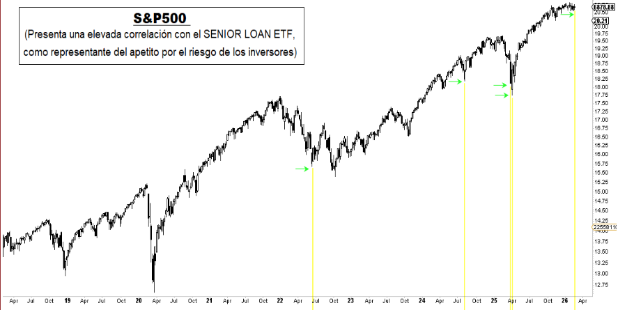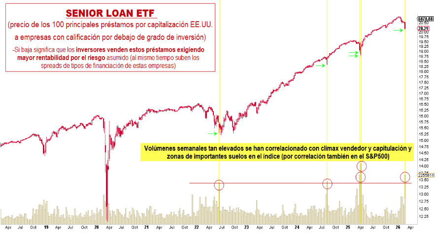 Con implicaciones históricamente positivas para los índices destacamos el alto volumen experimentado la semana pasada en el índice que engloba los 100 principales préstamos apalancados de EEUU (otorgados a compañías con calificación crediticia por debajo de grado de inversión). Este índice, como medidor del apetito por el riesgo inversor, se correlaciona con la evolución del S&P500. La semana pasada, influenciado por la aversión al riesgo en el sector Software, el índice experimentó un volumen históricamente elevado, siempre asociado a un clímax y claudicación vendedora. Estos eventos históricamente se han venido correlacionado con subidas del S&P500 semanas después.