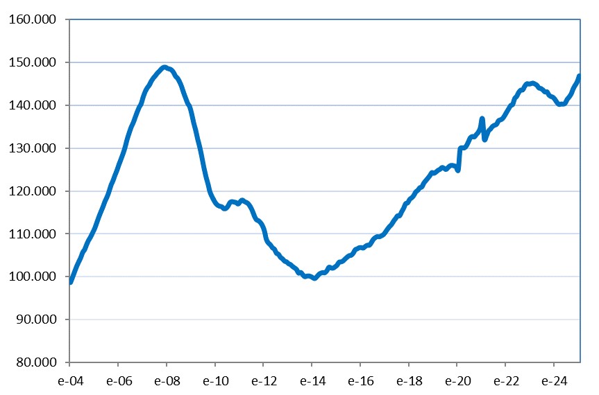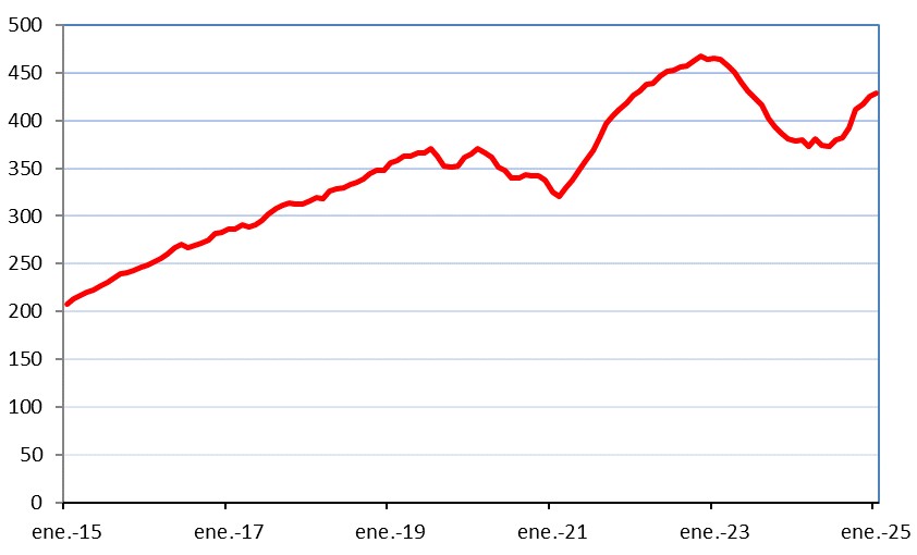 El crédito destinado a la compra de vivienda se beneficia de la expansión de la demanda por motivos demográficos y la moderación de los tipos de interés (el tipo de interés medio en enero fue del 3,08% según el INE, cuando había terminado 2024 en el 3,25%). El principal riesgo para el sector continúa siendo el fuerte aumento de los precios, que dificulta la accesibilidad de la vivienda, sobre todo en las zonas más tensionadas. No obstante, ese fuerte encarecimiento podría estar provocando un adelanto de las compras ante las expectativas de que la escasez de oferta de vivienda continúe presionando al alza los precios de la vivienda en los próximos trimestres.