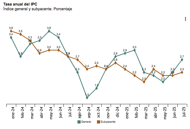CdM | La inflación se elevó cuatro décimas en julio, cuando el Índice de Precios de Consumo (IPC) situó su tasa interanual en el 2,7%, debido, sobre todo, al encarecimiento de la electricidad y los carburantes, según los datos definitivos publicados por el Instituto Nacional de Estadística (INE).