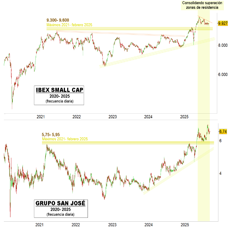 Renta 4 | Desde mediados del pasado mes de mayo el IBEX SMALL CAP se encuentra sumido en un proceso de consolidación, tras haber superado la zona de máximos desde 2021. De un modo similar, aunque con más momentum positivo, Grupo San José viene consolidando la superación de la franja entre 5,75 y 5,95 euros, máximos de aquel mismo año. La correlación entre el valor y su índice de referencia es evidente, como podemos comprobar debajo.