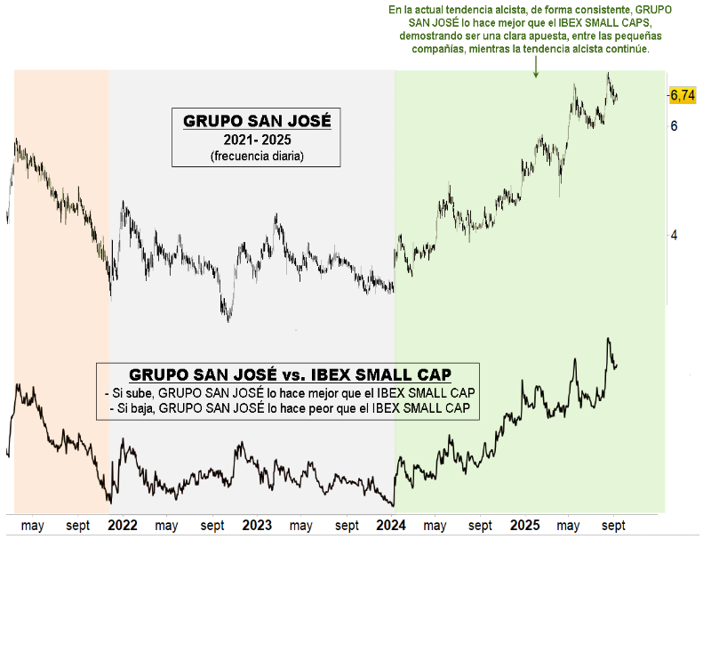 El motivo por el que Grupo San José es una clara apuesta entre las pequeñas compañías se evidencia en el gráfico inferior. Se aprecia la evolución entre el valor junto con el comportamiento relativo entre el valor y el índice IBEX SMALL CAP. De este modo, se aprecia cómo la constructora viene, de forma consistente, batiendo a su índice de referencia durante toda la tendencia alcista nacida a primeros de 2024. Si pensamos que el mercado tiene potencial alcista adicional, es probable que Grupo San José siga comportándose mejor que su índice.
