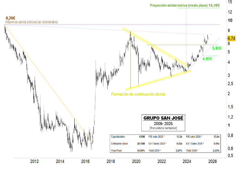 A nivel técnico, el valor sigue su proceso de recuperación hacia los máximos históricos de su salida a bolsa, en niveles de 9,20 euros, descontando los dividendos que ha ido pagando. Además, se aprecia debajo cómo subyace una importante proyección alcista teórica hacia niveles de 13 euros, tras haber solventado al alza un proceso de consolidación desde 2019 hasta 2023, completando una típica pauta de continuidad alcista. Los soportes clave de corto plazo se sitúa en 5,80 euros y en los mínimos de abril de este año, en 4,60 euros.