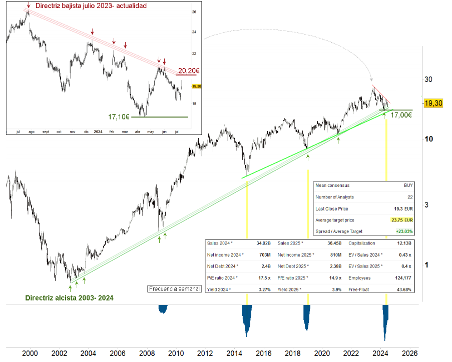 Renta 4 | El valor detuvo en abril la corrección desde los máximos históricos del año pasado en niveles de 17 euros, paso fiel de la directriz alcista que nace en los mínimos de 2003. A la contra, la directriz bajista desde dichos máximos históricos fija a su paso en 20,20 euros un nivel clave a batir. Los indicadores técnicos muestran parámetros propios de importantes suelos, que, unidos a las valoraciones del consenso, un 23% por encima, reflejan una buena rentabilidad/riesgo para adoptar posiciones alcistas con stops de protección por debajo de 17 euros.