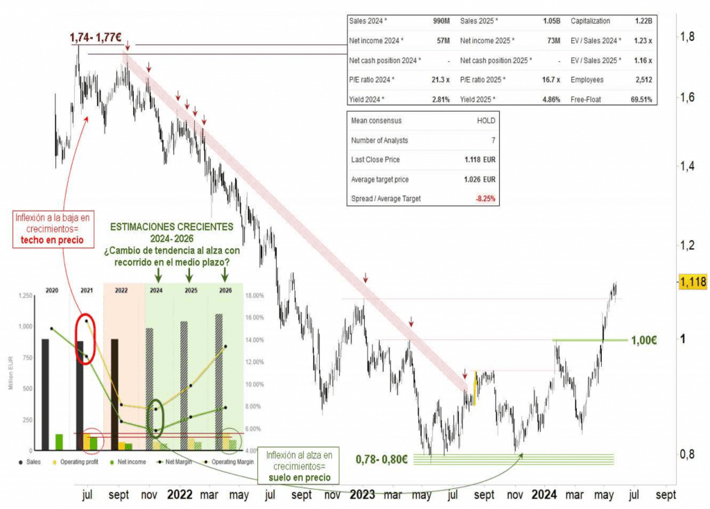 Renta 4 | El precio estructura un cambio de tendencia en su corta andadura bursátil, coincidiendo con el mejor tono de su índice el IBEX MEDIUM, como veremos en el segundo de los gráficos inferiores, así como por la inflexión al alza durante este año de sus principales cifras de negocio, la cual tiene visos de continuar en los años posteriores, según el consenso de analistas. A nivel de precios, la fuerte subida del 35% desde los mínimos de mediados de marzo presenta parámetros de sobrecompra a corto plazo, que podría dar lugar a la cercanía de un tramo de consolidación, presentando la primera zona de soporte importante en niveles de 1 euro.