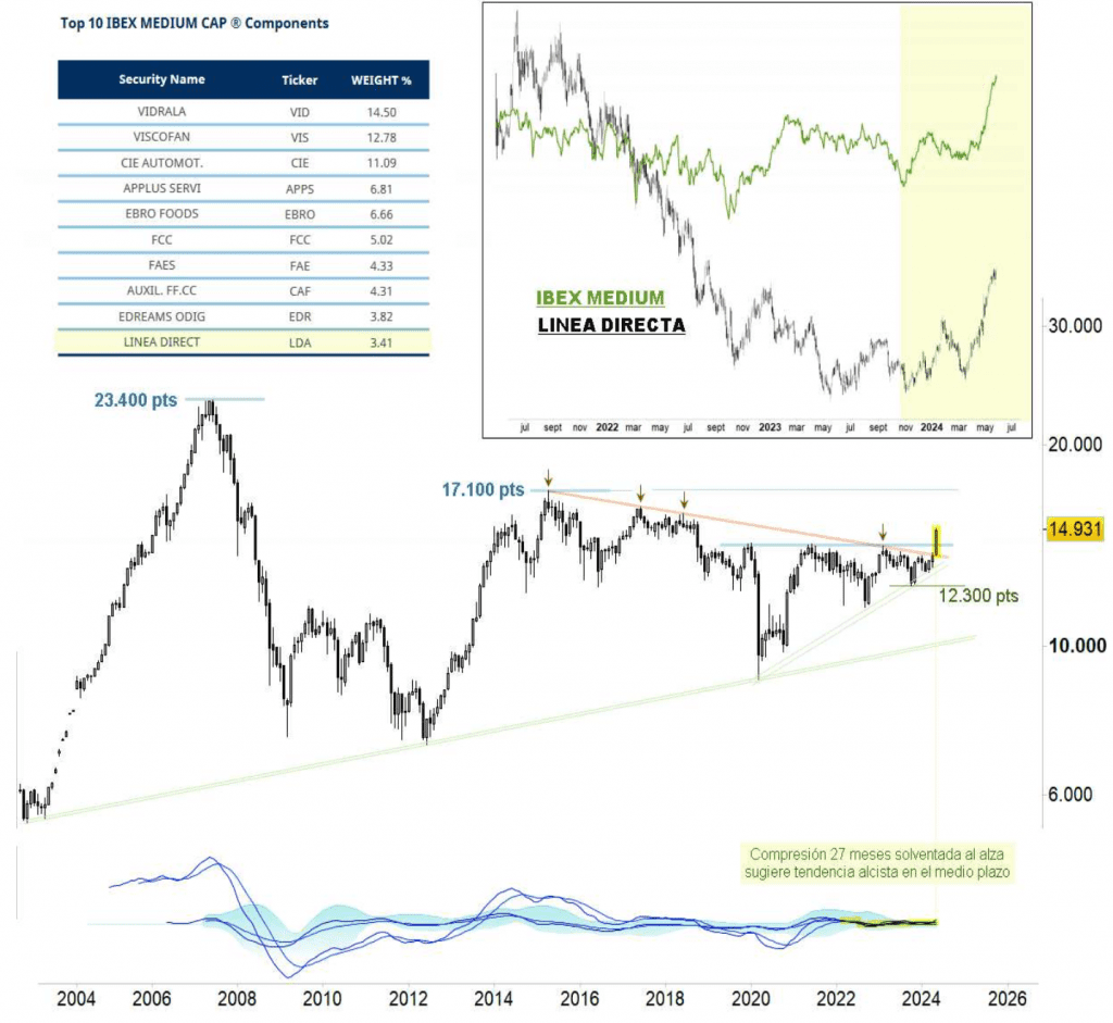 Otro gráfico para tener presente en el valor es la evolución del índice IBEX MEDIUM, como podemos ver debajo. El índice español viene rompiendo en mayo la tendencia bajista desde 2015, haciendo lo propio con la zona de resistencia de 2020, 2021 y 2022, que confluía con la directriz en una misma zona. La situación es favorable en el medio/largo plazo, lo que debería tener implicaciones alcistas por correlación en LINEA DIRECTA, que es uno de los diez principales componentes del índice.