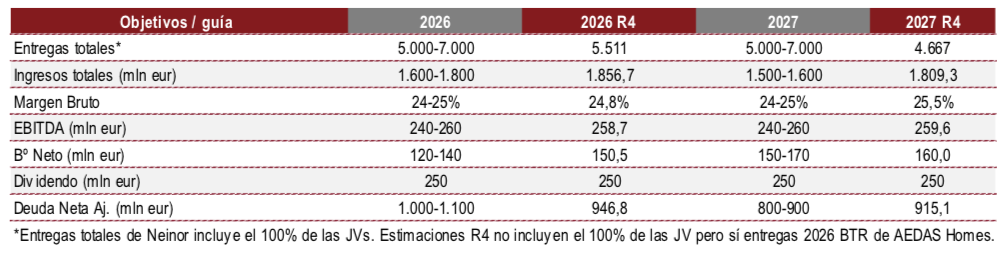 Renta 4 | Durante la jornada de ayer, Neinor Homes (HOME) celebró su Junta General de Accionistas, en la que especificó y reiteró guías a mercado de cara a los ejercicios 2026-2027, con positivas perspectivas pese a la incertidumbre geopolítica global. En este sentido, respecto a la amenaza del incremento de costes de construcción derivado del conflicto en Oriente Medio, la compañía recuerda que, respecto a las entregas previstas en 2026, los materiales de construcción necesarios ya están recepcionados, y respectos a las entregas 2027 ya se encuentran contratados, limitando potenciales impactos a corto plazo.