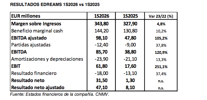 • Los ingresos totales de Edreams aumentaron un 4,8% en tasa interanual en el 1S26, hasta los 343,8 millones de euros, mientras que los ingresos procedentes del negocio Prime se incrementaron un 20% interanual, hasta los 294 millones de euros, reflejando el enfoque en el negocio Prime.