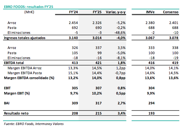El beneficio de Ebro Foods aumenta un +3,4% en 2025 hasta los 215 M€ gracias a un EBITDA récord de 421 M € que bate todas las estimaciones