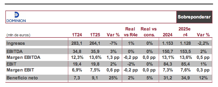 Renta 4 | Global Dominion ha publicado unos resultados trimestrales que muestran una positiva evolución de las principales métricas, en línea con las previsiones del mercado, pero que no están en consonancia con la negativa evolución de la acción. La cifra de negocios se ha reducido un 7% durante el 1T25 hasta los 264,1 millones de euros. No obstante, esta cifra está totalmente desvirtuada por las desinversiones efectuadas durante el pasado ejercicio. Así, el crecimiento orgánico del negocio ha ascendido al 7%, siendo un 13% el impacto negativo de las desinversiones al que se añade un ligero impacto negativo de las variaciones de tipos de cambio (-0,7 p.p.). El EBITDA aumenta un 3% hasta 35,9 millones de euros, que se traduce en una mejora del margen EBITDA sobre ventas de 130 p.b. para situarse en el 13,6%. El crecimiento del EBITDA en términos comparables asciende un 9%. El EBIT aumenta un 2% hasta 19,8 millones de euros (un +11% en términos comparables). El resultado neto atribuible se sitúa en 9,1 millones de euros tras aumentar un 25% i.a., crecimiento que se elevaría al 49% excluyendo el impacto de las desinversiones realizadas en el ejercicio precedente.
