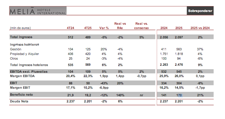 El beneficio de Meliá alcanza los 19 M€ en el 4T25 desde las pérdidas de 125 M€ del 4T24) con una aportación de las JVs de más de 3 M€