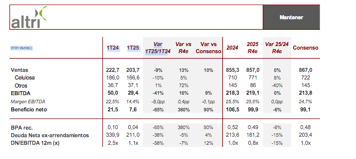 Renta 4 | Altri ha publicado sus resultados correspondientes al 1T25 superando nuestras estimaciones y las del consenso en un trimestre marcado por la caída de los precios de la pulpa durante 2S24 y el incremento de costes asociados a la avería en la planta de Biotek. En este contexto, la caída de las ventas alcanza el -9% i.a. (+13% vs R4e) y -41% i.a. en EBITDA (+16% vs R4e), registrando un margen operativo del 14,5%, en línea con nuestra estimación, pero muy por debajo del 23% de media en los últimos cinco años. El resultado neto alcanza los 7,6 millones de euros, -65% i.a., superando ampliamente nuestras estimaciones por la importante
