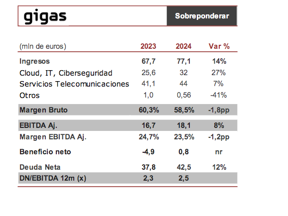 El beneficio neto de Gigas en 2024 alcanza los 0,75 M€ frente a las pérdidas de -4,9 M€ en 2023, superando los objetivos de la guía revisada