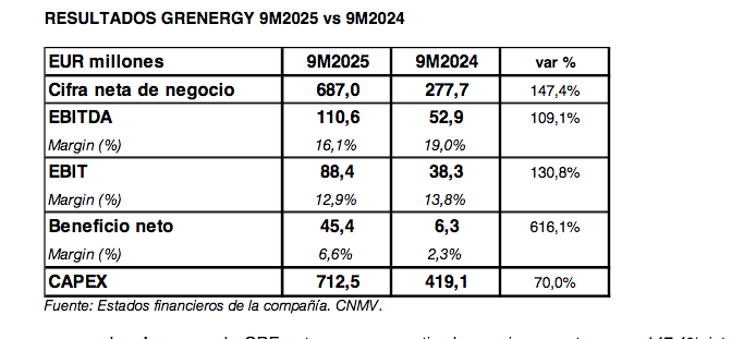 • Finalmente, el beneficio neto de Grenergy en 9M25 se elevó hasta los 45,4 millones de euros, que compara positivamente con los 6,3 millones de euros obtenidos en el mismo periodo del año precedente.