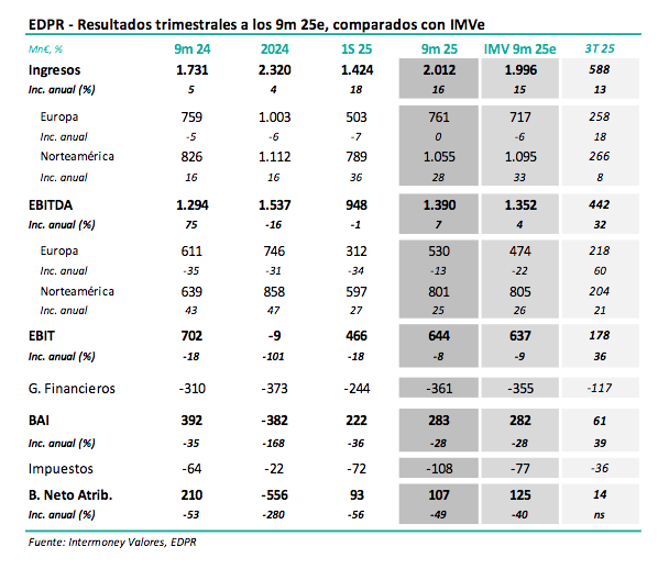 Asimismo, EDPR (Comprar, PO 15 €) ha presentado sus resultados semestrales del 1S25. El EBITDA subió un +7% hasta 1.390 M€ (1.352 M€ IMVe), por crecimientos en producciones (+14%), especialmente en Norteamérica (+20%). Factores menos favorables incluyendo menores precios en España (-16%) y en general en el resto de Europa donde cayeron un -10% hasta 82 €/MWh. En el conjunto del Grupo, el precio medio descendió un -9% hasta 54 €. Hubo un impacto de rotaciones en el 3T de unos 50 M€; sin este factor pues el EBITDA homogéneo estimamos que hubiese crecido un +21%. Por debajo de EBITDA no hubo grandes novedades, al contrario que en el 4T24, más allá de mayores depreciaciones, conduciendo a un resultado neto de 107 M€ (-56%, pero más del doble excluyendo rotaciones), frente a 125 M€ IMVe.
