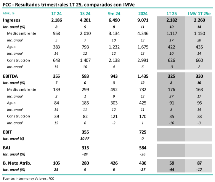 Intermoney | Resultados trimestrales 1T 25 – EBITDA proforma +8% (+10% IMVe) proforma por desconsolidación de cemento e inmobiliaria. FCC (Comprar, PO 13,5 €) publicó sus resultados del 1T 25 este miércoles antes de la apertura, celebrando una conferencia telefónica a las 9 horas. Las cifras principales, junto a nuestras estimaciones, se muestran en la tabla adjunta. El Grupo no consolida ya globalmente los negocios de cemento e inmobiliaria, que comenzaron a cotizar en noviembre bajo el nombre de Inmocemento, y las variaciones en estas cifras están ajustadas proforma. Los resultados han mostrado los esperados mayores crecimientos en Servicios Medioambientales, ayudado por otra parte por la contribución de las adquisiciones recientes. Todo ello desembocó en un crecimiento proforma de EBITDA para FCC del +8% hasta 325 Mn€ (330 Mn€ IMVe). FCC reportó solo cifras hasta EBITDA, además del resultado neto, que cayó un -44% hasta 59 Mn€ bastante por debajo de IMVe (87 Mn€), debido a la no contribución de los activos de cemento e inmobiliaria y tipo de cambio desfavorable. En el previo de estos resultados elevamos nuestras previsiones de EBITDA una media del +3% en 25e-27e, que confirmamos tras las cifras de este miércoles.