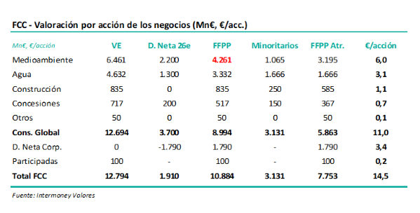Valoración: Esta transacción se lleva a cabo a un precio bastante similar a la compra inicial por parte de CPP del 25% en 2023, unos 965 M€. En nuestra valoración de FCC, el 100% de los fondos del negocio de servicios medioambientales lo valoramos en unos 4.300 M€, como mostramos en la tabla inferior. La transacción anunciada ayer implicaría pues una valoración algo inferior (4.000 M€), aunque nosotros hemos fijado como fecha de descuento de flujos diciembre 2026e, mientras que la transacción tiene razonablemente una fecha más cercana, con lo que no vemos diferencias importantes entre una y otra. La transacción implica un VE del negocio de unos 6.200 M€, o 7,2x el EBITDA que esperamos en 2026e. Medioambiente es con cierta diferencia el mayor negocio del Grupo, aportando un 53% del EBITDA consolidado (862 M€ en 2026e), aproximadamente, en especial tras las adquisiciones realizadas recientemente en Reino Unido, su mercado más importante después de España.