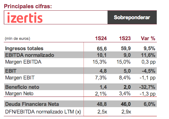 Renta 4 | La cifra de ingresos total crece un 9,5% vs 1S23, reflejando la positiva evolución del negocio. El Mg. EBITDA normalizado en el 1S24 alcanzó el 15,3%, superior al 15,0% del 1S23 y claramente por encima del nivel objetivo de 13,2% que Izertis se marcó en el Plan Estratégico 23-27. Los márgenes alcanzados son fruto del enfoque de Izertis en ofrecer servicios de la capa de valor más alta (con mayor componente tecnológico).