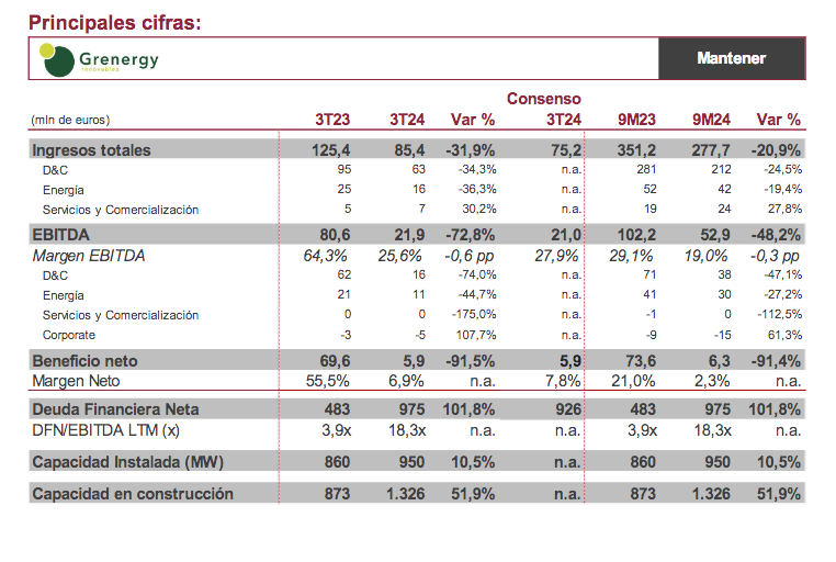 Renta 4 | A pesar de que las cifras reportadas en el 3T24 están por encima de lo esperado por el consenso, la ausencia de extraordinarios (sin rotación de activos vs un 2023 muy activo en ventas) y unos precios de la energía más bajos que el ejercicio anterior, desdibujan los resultados frente al año anterior. Adicionalmente, fruto del importante plan de inversiones que está realizando la compañía (CapEx 419 mln eur), la DFN se incrementa hasta los 975 mln eur (vs 483 mln eur 3T23).