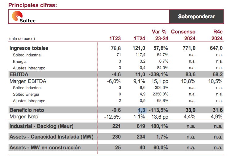 Renta 4 | Soltec ha presentado en el día de hoy los resultados del 1T24, los primeros resultados después de que el auditor obligase a reformular las cuentas de 2023. Las cuentas publicadas son sólidas, a pesar de la estacionalidad que suele caracterizar al primer trimestre del ejercicio en el segmento industrial.