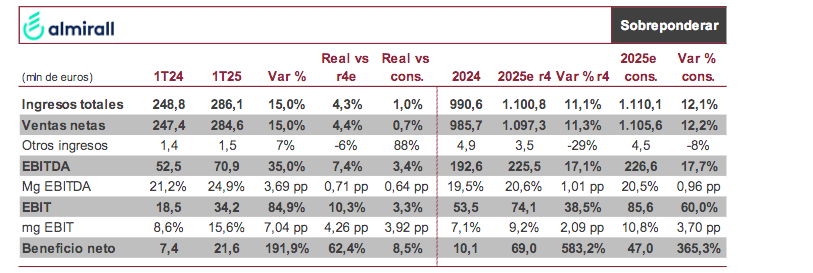 Consideramos que los resultados se sitúan en la buena dirección para el cumplimiento de los objetivos del grupo en 2025 (crecimiento de ventas netas de entre el 10% y el 13% situando el EBITDA en un rango de entre 220 millones de euros y 240 millones de euros). Reiteramos recomendación de SOBREPONDERAR, y P.O. 12 eur/acc.