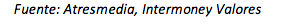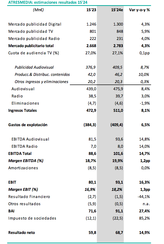 Intermoney | Ingresos: En términos consolidados, prevemos un +8,1% en los ingresos del grupo (hasta los 511Mn€). En la división Audiovisual esperamos un aumento del +8,4% de los ingresos del área hasta los 476 M€: +9% en publicidad (TV+Digital), +10% en producción y distribución de contenidos y +0% en otros ingresos. En Radio prevemos un +3% en ingresos (con un +6% en 2T tras quedarse planos en 1T por la significativa caída sufrida en marzo por el efecto Semana Santa y que evaporó los crecimientos de enero y febrero).