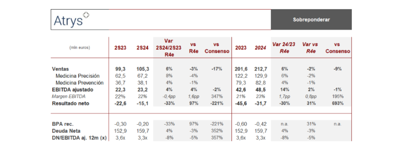 Renta 4 | Atrys Health ha publicado sus resultados anuales 2024 en línea con nuestras estimaciones y por encima del consenso en ventas, +5,5% i.a. (+7,2% i.a. a tipo de cambio constante), con una reducción en el margen bruto (-2,6 pp i.a.) debido al cambio en el mix de ventas, con mayor crecimiento en el negocio de oncología, de menor margen. A nivel EBITDA ajustado las cifras mejoran ligeramente nuestras estimaciones (+3% vs R4e), logrando un crecimiento del +14% i.a., con una importante expansión de márgenes en el año (+1,7 pp i.a.), aunque moderando ligeramente en 2S24 vs 1S24, reflejando los efectos del apalancamiento operativo y el plan de ahorro de costes y eficiencias ejecutados durante el año.