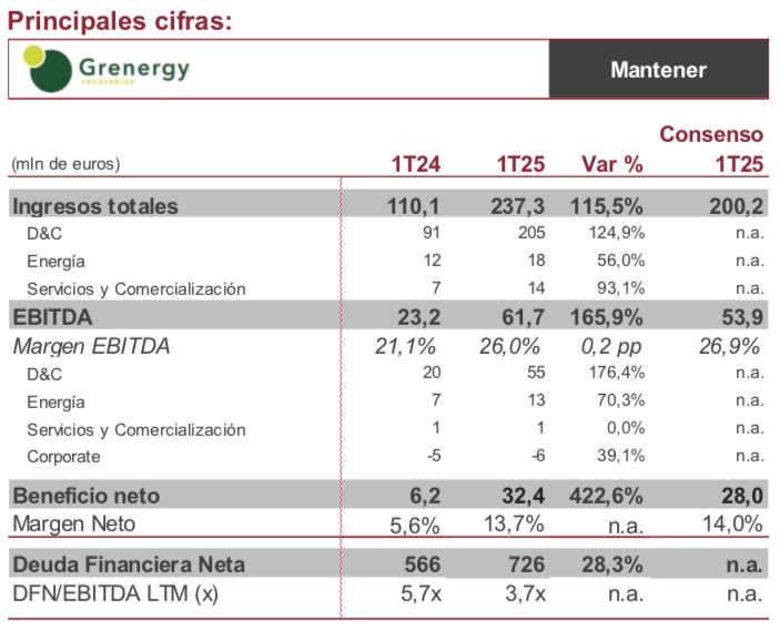 En conjunto, las cifras presentadas son positivas, mostrando importantes avances en todas las líneas de actividad y superando las expectativas del consenso de analistas. Teniendo en cuenta el gran comportamiento de la acción en las últimas semanas, creemos que los resultados podrían estar descontados por el mercado, por lo que esperamos un impacto neutro o ligeramente positivo en la sesión de hoy. Las acciones de Grenergy acumulan una revalorización del 71% en 2025 y 96% en los últimos 12 meses.