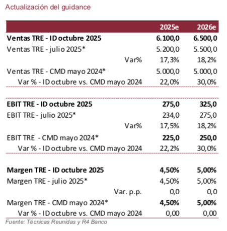 Renta 4 | Conclusión del Día del Inversor: muy positivo y el mercado reconoce con una revalorización del +9.19%. Técnicas Reunidas (TRE) ha celebrado el 2 de octubre el Día del Inversor del que extraemos una valoración positiva y que resumimos en 4 puntos clave: 1) plan SALTA evoluciona favorablemente, 2) mejora del guidance 2025 y 2026, 3) repago anticipado de los préstamos de la SEPI (1 de diciembre) y 4) vuelta a la remuneración al accionista con cargo a los resultados de 2026 con un primer dividendo intermedio que se pagará en 4T26. Hemos revisado al alza nuestras estimaciones y precio objetivo hasta 33,0 eur/acción vs. 29,3 eur/acción anterior y reiteramos nuestra recomendación de Sobreponderar.
