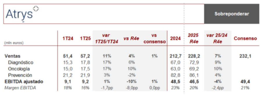 Renta 4 | Atrys Health (ATRY) ha publicado sus resultados trimestrales 1T25 quedando en línea con las estimaciones del consenso de Factset y ligeramente por debajo de las nuestras en EBITDA. El crecimiento de los ingresos alcanza el +11% i.a. (+4% vs R4e y +1% vs consenso), con incrementos de doble dígito tanto en oncología (+17% i.a.) como en diagnóstico (+17% i.a.), mientras a nivel EBITDA el crecimiento es del +7% i.a. y del 1% i.a. en términos ajustados por gastos no recurrentes (-10% vs R4e y +1% vs consenso), registrando una caída de 1,7 pp en el margen EBITDA ajustado debido al cambio en el mix de negocio hacia áreas de menor margen bruto (-4,7 pp), como oncología médica y diagnóstico que crecen por encima del resto, y que se compensa parcialmente con los programas de eficiencia y contención de gastos.