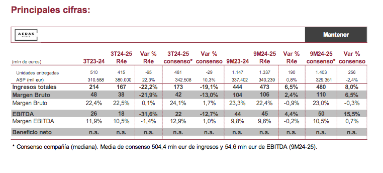 En cuanto a margen bruto, prevemos estabilidad en niveles del 22,5% en 3T24-25. Respecto a la actividad comercial de la compañía, prevemos que AEDAS haya registrado nuevamente un nivel de preventas en 3T24-25 superior a las 600 unidades (822 unidades vendidas en 1T24-25 y 670 unidades en 2T24-25; 626 unidades promedio trimestral en el ejercicio anterior), dando continuidad al buen momento comercial en un contexto de desequilibrio oferta- demanda de vivienda de obra nueva en España.