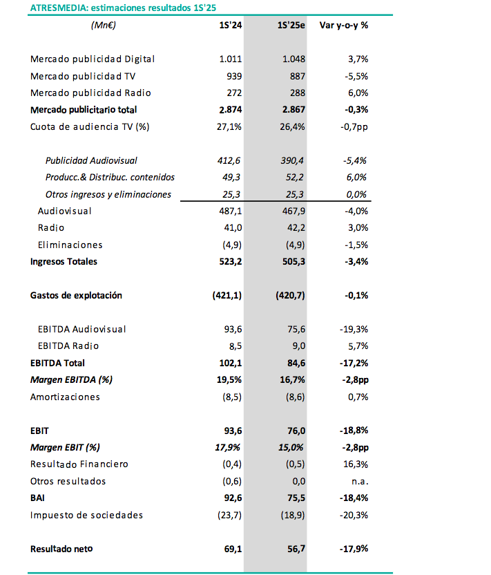 - A falta de conocer los datos de Infoadex, pensamos que el mercado publicitario en TV ha caído un más de un 7% en 1S25e. Aunque pensamos que la evolución sí ha sido positiva en Digital y, sobre todo, en Radio (+6%e), el importante peso que tiene la publicidad en TV en los ingresos del grupo habrá lastrado la evolución de los resultados del grupo en el semestre.