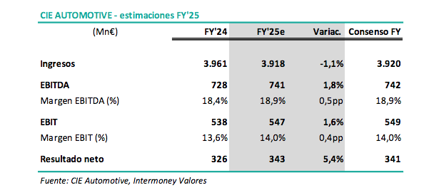 • Márgenes en máximos históricos: a pesar de las menores ventas, creemos que CIE habrá mejorado su margen EBITDA hasta rozar el 19% (+0,5 p.p. vs 2024) y el margen EBIT hasta el 14% (+0,4pp), ambos en niveles récord de rentabilidad.