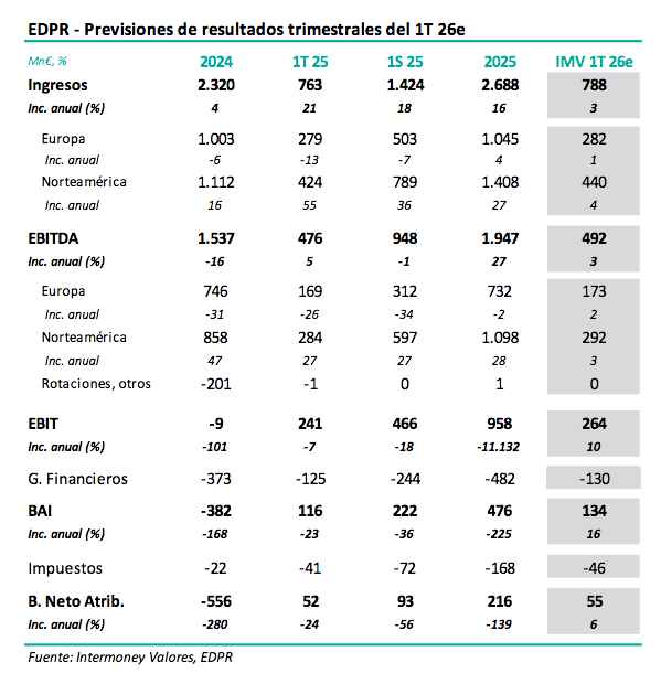 Intermoney | EDPR (Comprar, PO 14 €) anunciará sus resultados del 1T26e el miércoles 6 de mayo antes de la apertura, celebrando una presentación a las 16:30h. Los principales datos de nuestras previsiones se pueden consultar en la tabla adjunta. Esperamos que el EBITDA haya subido un +3% respecto a 1T25 hasta 492 M€, debido principalmente al ya reportado incremento de producción del +3%, pese a la exigente comparación de 2025, la ausencia de efectos de rotaciones y Forex desfavorable. Por mercados, no esperamos que haya en esta ocasión grandes diferencias. Estimamos un beneficio neto de 55 M€, donde una mayor partida por minoritarios limitaría el incremento interanual al +6%. Subimos ligeramente (+2%) nuestras previsiones tras los resultados anuales, aunque seguimos estimando un TACC de EBITDA del +6% en 25-28e.