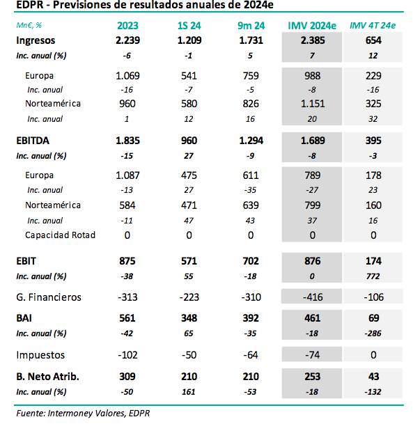 Subida en ingresos, +7% a diciembre 24e, debido principalmente a un +17% de producción en Norteamérica. Esperamos que los ingresos de EDPR se hayan incrementado a diciembre 24e en un +7% en el entorno de los 2.400 M€, debido principalmente crecimientos en Norteamérica, compensando bajadas moderadas en España y el resto de Europa y más notables en Sudamérica. Según el operational review de la empresa a diciembre 24e, la