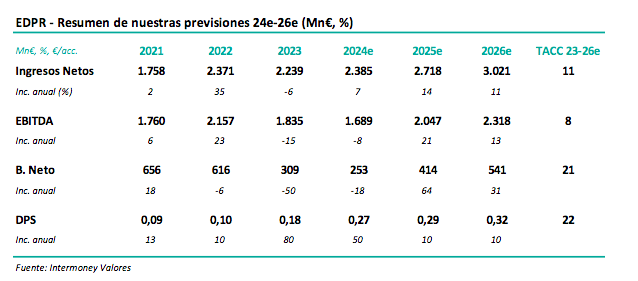 Intermoney | EDPR (Comprar, PO 19 €) anunciará sus resultados a miércoles 26 de febrero tras el cierre del mercado en Lisboa, celebrando una presentación ese mismo día a las 18 horas. Los principales datos de nuestras previsiones se pueden consultar en la tabla adjunta. Esperamos que el EBITDA haya descendido un -8% hasta 1.689 M€, debido precios más bajos así como a una menor rotación de activos en este año, concretamente una cantidad prácticamente nula que asumimos durante el 4Te estanco.