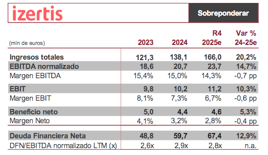 En este contexto, estimamos que los ingresos alcancen los 166 millones de euros, lo que supondría un crecimiento del 20,2% interanual frente a 2024. A nivel operativo, proyectamos un EBITDA normalizado de 23,7 millones de euros (+14,7% vs 2024). En términos de rentabilidad, anticipamos una ligera normalización de márgenes, con el margen EBITDA situándose en 14,3% (-0,7 p.p.) y el margen EBIT en 6,7% (-0,6 p.p.). No obstante, estos niveles seguirían posicionando a Izertis en el rango alto dentro del sector de servicios IT, reflejando la buena calidad de su mix de negocio y la eficiencia operativa alcanzada en los últimos ejercicios. En la parte baja de la cuenta de resultados, esperamos que el beneficio neto alcance los 4,6 millones de euros, lo que implicaría un crecimiento del 5,6% interanual. Desde el punto de vista financiero, prevemos que la compañía continúe mostrando una sólida generación de caja, lo que permitiría mantener una estructura de balance equilibrada. En concreto, estimamos que la ratio DFN/EBITDA normalizado LTM se sitúe en torno a 2,8x, ligeramente por debajo del nivel registrado en 2024 (2,9x), pese al esfuerzo inversor en adquisiciones realizado durante el ejercicio. No obstante, las cifras de apalancamiento se habrían reducido de forma significativa a comienzos de 2026 (<1x EBITDA), tras la ampliación de capital de 51,3 mln eur ejecutada en el mes de enero.