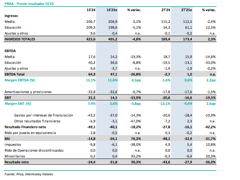 En Santillana (-5% en ingresos y -9% en EBITDA) esperamos un descenso significativo en los resultados operativos del semestre (aunque con una mejora en 2T) por el impacto comentado de los extraordinarios y de los tipos de cambio.