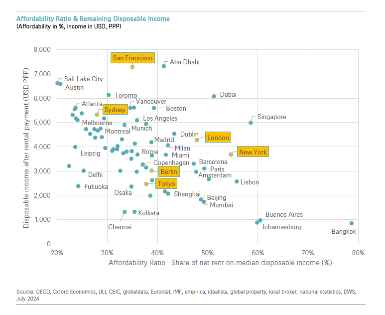 Dada la creciente prevalencia de viviendas en alquiler dentro de las carteras institucionales, junto con los desafíos de asequibilidad que han surgido desde la crisis, nuestro análisis se centra en el alquiler, comparando medidas de asequibilidad en las principales ciudades del mundo. Para monitorear la evolución de la asequibilidad global, revisaremos este análisis anualmente.