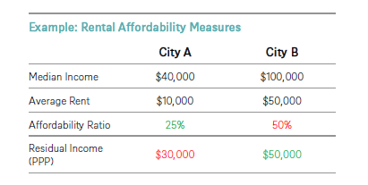 Este método es menos común para medir la asequibilidad del alquiler, pero es una consideración importante, dada la complejidad de usar un ratio en ciudades con una amplia gama de ingresos medios. Esto podría generar la mayor carga del alquiler en ciudades de ingresos bajos. Como se muestra en el ejemplo a continuación, en una ciudad de ingresos bajos, una persona que alquila puede gastar una menor proporción de su ingreso en alquiler, pero también podría quedarse con considerablemente menos dinero, después de realizar los pagos de alquiler.
