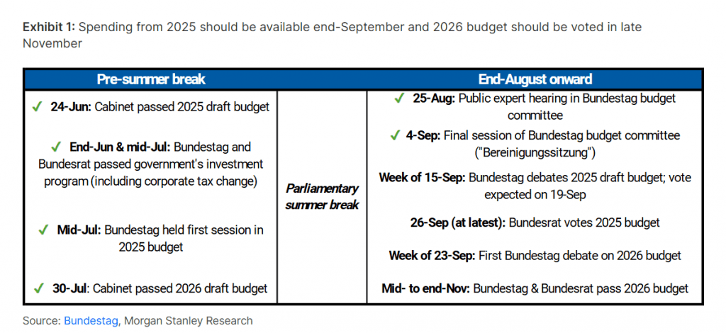 Morgan Stanley | Jens Eisenschmidt, nuestro macro de la Unión Europea, organizó la semana pasada un viaje con inversores a Berlín, en el que se reunieron con el Ministerio de Economía y Energía, el Ministro de Transformación Digital y Modernización del Gobierno, y el Secretario de Estado de Finanzas, entre otros. La nueva administración alemana ha mostrado una firme voluntad de reactivar el crecimiento económico reconociendo los retos estructurales existentes y poniendo en marcha una agenda de reformas. Algunos de los temas tratados fueron la expansión fiscal, fomentar la inversión privada, el impulso para la innovación y el compromiso con la UE. Eisenschmidt mantiene su previsión de que 2026 traerá una mejora en el crecimiento (MSe y css: 1.0%Y, vs 0.3%Y 2025e). Por otro lado, Marina Zavolock (Equity EU) salió del viaje con una visión positiva sobre el potencial de reforma y gasto a largo plazo en Alemania, aunque anticipa que hacia fin de año el ritmo de gasto podría quedarse algo por debajo de las elevadas expectativas de los inversores, especialmente el relacionado con el fondo de infraestructuras. Marina considera que las acciones de este sector podrían experimentar una pausa táctica, mientras que las acciones domésticas sin exposición directa al gasto fiscal podrían enfrentar presiones a la baja. Por otro lado, espera mayor claridad sobre los presupuestos de Defensa y prevé un rebote en las acciones europeas de Defensa en el corto plazo, liderado por Alemania.