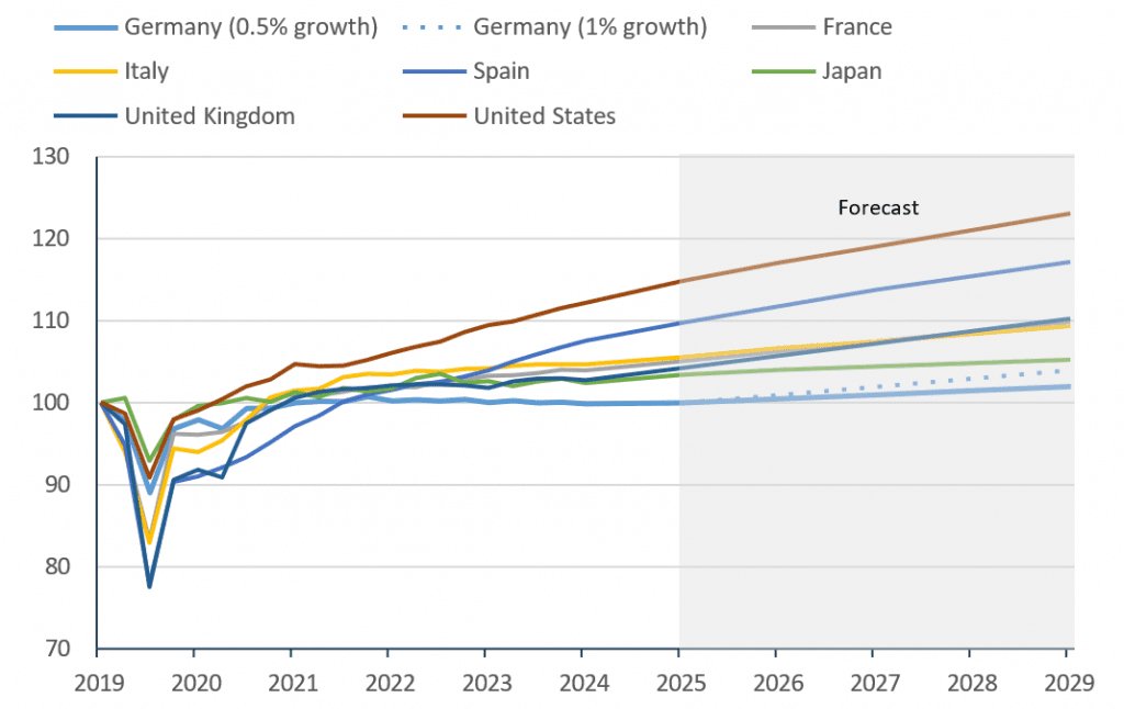 Desde 2019, la expansión del PIB en España (+8%), Italia (+5%), Francia (+4%) y Reino Unido (+3%) ha superado a la de Alemania, al igual que las tasas de crecimiento en Japón (+2%) y Estados Unidos (+12%). Con las crecientes presiones demográficas, situamos el potencial de crecimiento a medio plazo en torno al 0,5-0,7%.