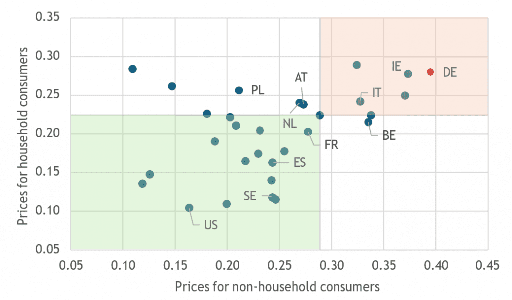 Una forma que Alemania tiene de abordar sus elevados costes energéticos es a través de una mayor inversión en infraestructura energética para integrar mejor los crecientes volúmenes de electricidad solar y eólica intermitente. Sin embargo, depender principalmente de los compromisos del sector privado mantendrá los precios de la electricidad en Alemania entre los más altos de la UE (Gráfico 2), ya que las empresas trasladan los costes a los usuarios finales.