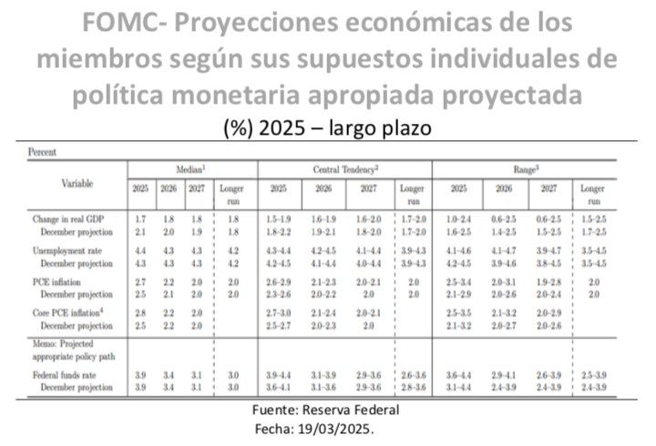 Estas políticas están poniendo un nuevo obstáculo a la Reserva Federal, donde el encuentro de marzo servía para conocer la nueva evaluación del escenario actual. El banco americano mantuvo la horquilla de los fed funds sin cambios en el 4,25%-4,50% pero eran otros detalles los que otorgaban una gran importancia al encuentro, como el nuevo panorama político y la actualización del Resumen de Proyecciones Económicas. La reunión, como decimos, se producía en una posición complicada como resultado de la incertidumbre derivada de la guerra comercial en expansión. Son un desafío para el banco, puesto que amenazan con frenar el crecimiento, pero también aumentar los precios y así quedaban recogidas en su cuadro macro para el que el banco revisaba a la baja el crecimiento y al alza los precios. En el comunicado, se indicaba que la “incertidumbre sobre la perspectiva económica ha aumentado” y, lo que era más importante, se eliminaba la referencia de que los riesgos para el empleo y la inflación estaban “aproximadamente equilibrados”.