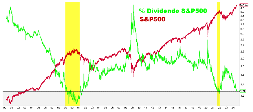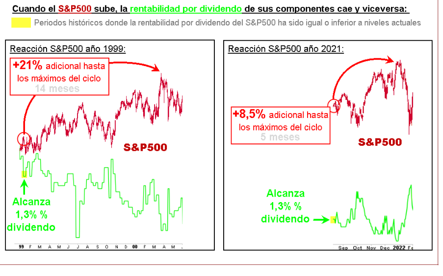 Renta 4 | Las imponentes subidas en la bolsa americana han provocado que el dividendo histórico del S&P500 se haya reducido a niveles históricamente bajos, actualmente del 1,28%. Debajo mostramos un gráfico histórico de la rentabilidad por dividendo del S&P500 y del índice en los últimos 34 años. Enfatizaremos también en las dos últimas ocasiones en las que se produjeron rentabilidades como las actuales (1999 y 2021) y las reacciones posteriores del S&P500: